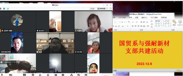 12月6日,国际经济与贸易系党支部与河南强耐新材股份有限公司党支部在线上开展支部党建共建活动。强耐新材党支部组织委员武丽萍、国贸系党支部书记张永恒等十余位党员参加活动。